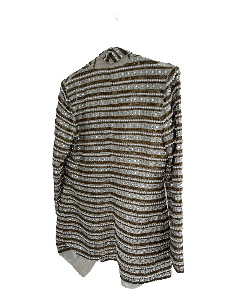Unleash glamour with Virgos Lounge Women's Grey Jacket—a rare jewel embellished pearl beaded blazer. GLAM up your look with the white and gold heavily beaded jeweled jacket, showcasing an exquisite blend of style and sophistication.