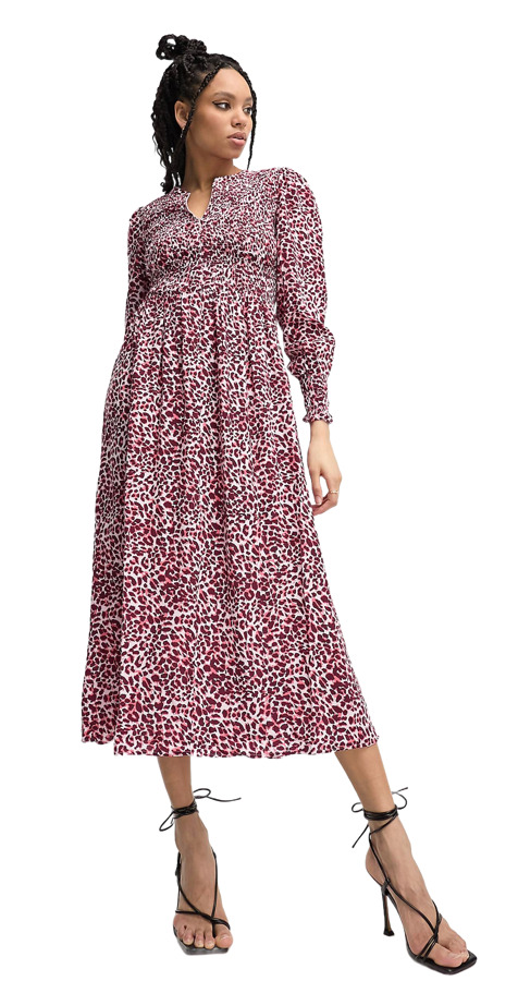 This midi dress by Whistles features an A-line silhouette and an eye-catching abstract animal print. With a classic neckline and long sleeves, it offers a relaxed yet stylish option for office dressing. Perfect for transitioning from work to after-hours, this dress combines comfort with sophistication.