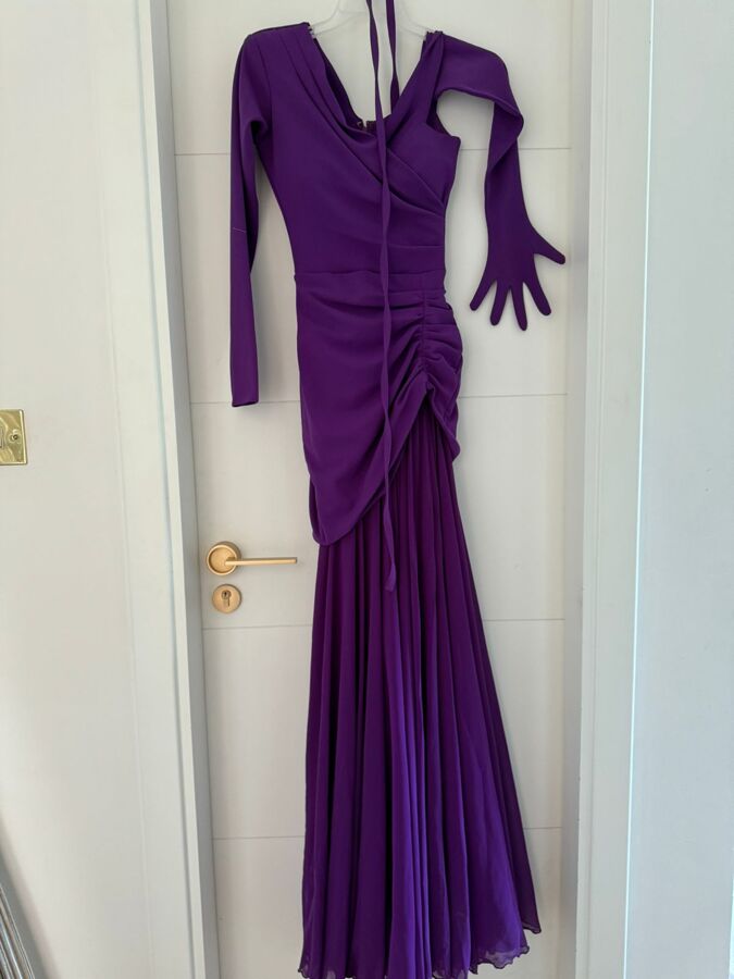 The Scuba Crepe-Chiffon Gown from the Spring/Summer 2022 collection is a captivating purple creation. Crafted from a blend of scuba crepe and chiffon, this gown offers a harmonious interplay of structure and fluidity. The rich, vibrant purple hue adds a sophisticated, regal element to the design.