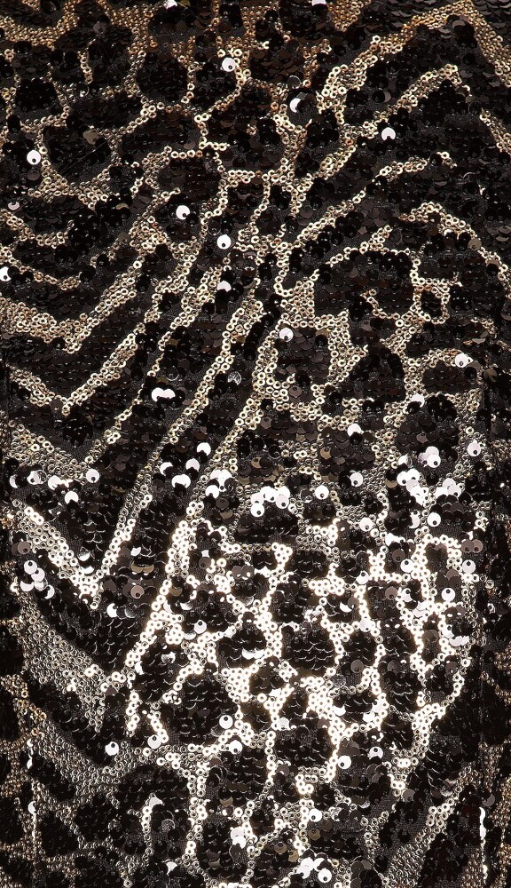This dazzling dress is a showstopper, adorned with striking sequin embellishments from head to toe. The fully lined construction provides a smooth, structured silhouette, while the hidden back zipper closure ensures a seamless, streamlined fit. Padded shoulders lend an air of confident sophistication to this captivating piece.