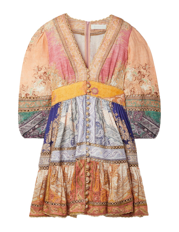 The Zimmermann Anneke Mini Dress features a stunning paisley print crafted from mid-weight linen. This dress is adorned with delicate bead details and lattice trims, complemented by metallic accents for a touch of elegance. The gathered design includes sleeves with elasticated cuffs, enhancing its feminine silhouette. It features a concealed zip fastening at the back for easy wear. Made from non-stretchy fabric, this mini dress is perfect for stylish summer occasions.